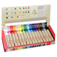 16 krijtjes in een doosje: wit, roze, rood, oranje, koraal, geel, licht groen, groen, licht blauw, midden blauw, d. blauw, paars, grijs, licht bruin, bruin en zwart. De krijtjes kleuren op papier, ramen, glas, whiteboards en spiegels. Met een natte doek kan je het eenvoudig weer verwijderen van je ramen, whiteboards en spiegels. Je kan het niet verwijderen van papier. Met een klein beetje water erbij kan je ook verven met de krijtjes. Op het doosje vind je kleursuggesties om te mengen.