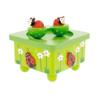 Een mooi, houten muziekdoosje met dansende lieveheersbeestjes erbovenop.